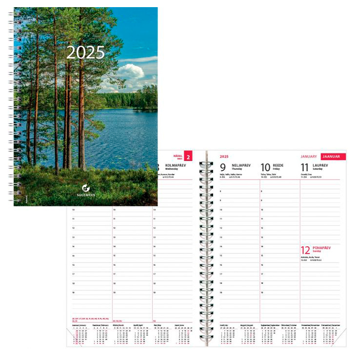 Kunstnahast kaantega kõvas köites kalender, lk. mõõt 145×202 mm. Kalendaarium sisaldab riigipühi, riiklikke ja rahvakalendri tähtpäevi, lipupäevi, nimepäevi, 42 riigi pühi lühenditena, päikese tõusu ja loojangu aegu, kuu faase, aastaaegade alguseid, käesoleva ja järgneva aasta plaane, aasta tabelkalendreid, foneetilisi tähestikke, mõõtühikute teisendamise tabelit ja tabeleid enamuse maailma riikide telefoni koodide, valuuta, ajavahe jne kohta, 16 lk Eesti kaardivihik. Kaane siseküljel Euroopa ja maailma kaart.