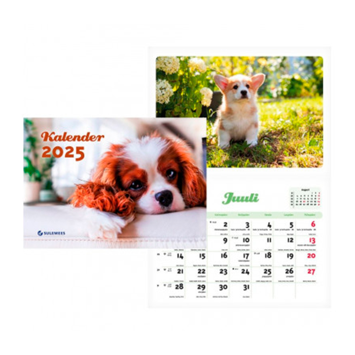 Kolme kuu vaatega seinakalender. Avatud mõõt koos pildiga 297x630mm. Punane staatiline kuupäevamärkija. Kalendaarium sisaldab riigipühi, riiklikke ja rahvakalendri tähtpäevi, lipupäevi, päikese tõusu ja loojangu aegu, kuu faase, aastaaegade alguseid. Päeva ja kuu nimed eesti ja inglise keeles. Lehe parempoolsel küljel päevalahtrid sünnipäevade või sündmuste märkimiseks. Tellides oma pildi ja/või reklaamribaga hind muutub.