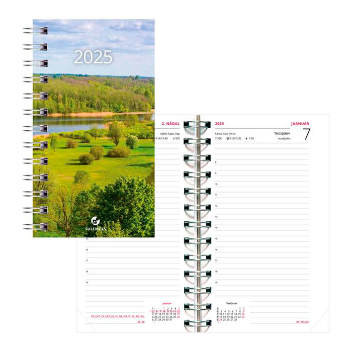 Nädala- ja vertikaaljaotusega spiraalköites kalendri sisu, lk. mõõt 142×202 mm. Kalendaarium sisaldab riigipühi, riiklikke ja rahvakalendri tähtpäevi, lipupäevi, nimepäevi, 42 riigi pühi lühenditena, päikese tõusu ja loojangu aegu, kuu faase, aastaaegade alguseid, käesoleva ja järgneva aasta plaane, aasta tabelkalendreid, foneetilisi tähestikke, mõõtühikute teisendamise tabelit ja tabeleid enamuse maailma riikide telefoni koodide, valuuta, ajavahe jne kohta.
