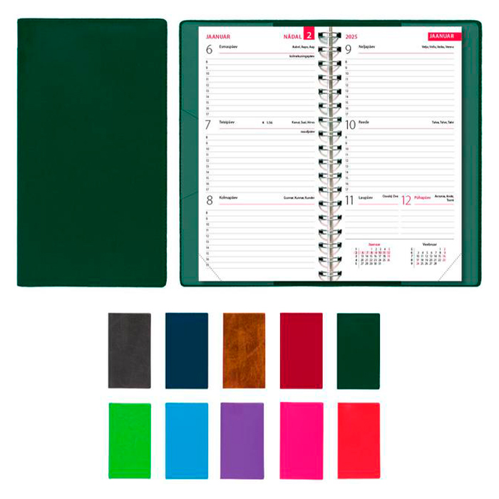 Pildiga spiraalköites kalender, lk. mõõt 142×202 mm. Kalendaarium sisaldab riigipühi, riiklikke ja rahvakalendri tähtpäevi, lipupäevi, nimepäevi, 42 riigi pühi lühenditena, päikese tõusu ja loojangu aegu, kuu faase, aastaaegade alguseid, käesoleva ja järgneva aasta plaane, aasta tabelkalendreid, foneetilisi tähestikke, mõõtühikute teisendamise tabelit ja tabeleid enamuse maailma riikide telefoni koodide, valuuta, ajavahe jne kohta.