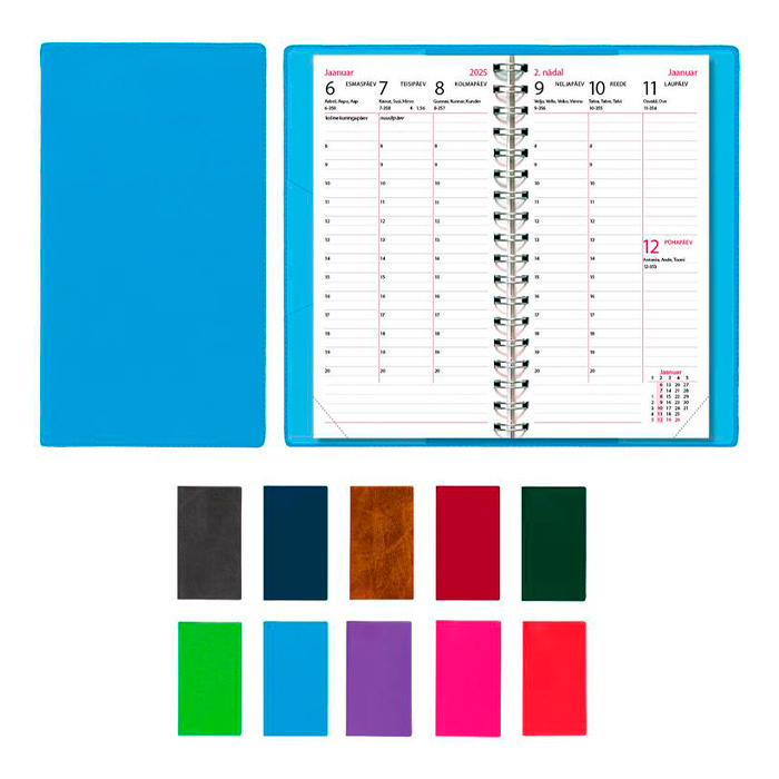 Pildiga spiraalköites kalender, lk. mõõt 142×202 mm. Kalendaarium sisaldab riigipühi, riiklikke ja rahvakalendri tähtpäevi, lipupäevi, nimepäevi, 42 riigi pühi lühenditena, päikese tõusu ja loojangu aegu, kuu faase, aastaaegade alguseid, käesoleva ja järgneva aasta plaane, aasta tabelkalendreid, foneetilisi tähestikke, mõõtühikute teisendamise tabelit ja tabeleid enamuse maailma riikide telefoni koodide, valuuta, ajavahe jne kohta.